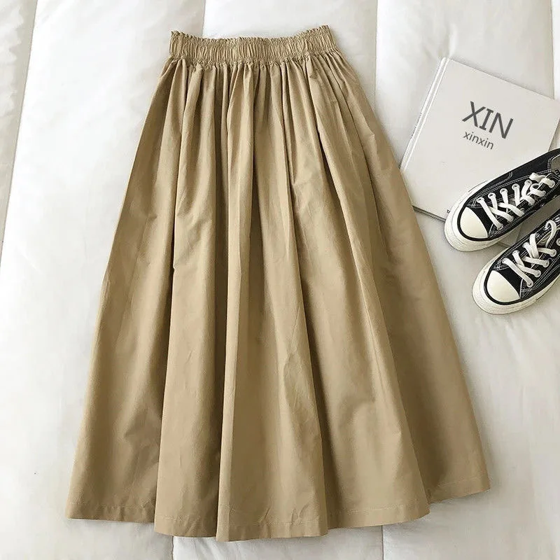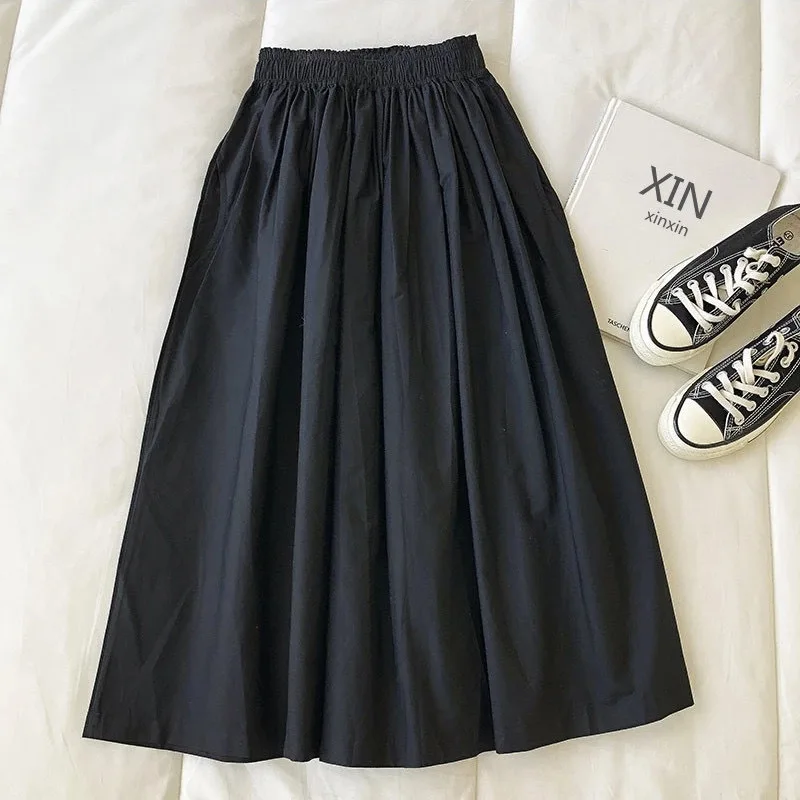Women White Long Skirt Fashion Pockets Pleated Knee Length Skirts Autumn 2024 New Casual Elegant High Waist A Line Femme Skirts
